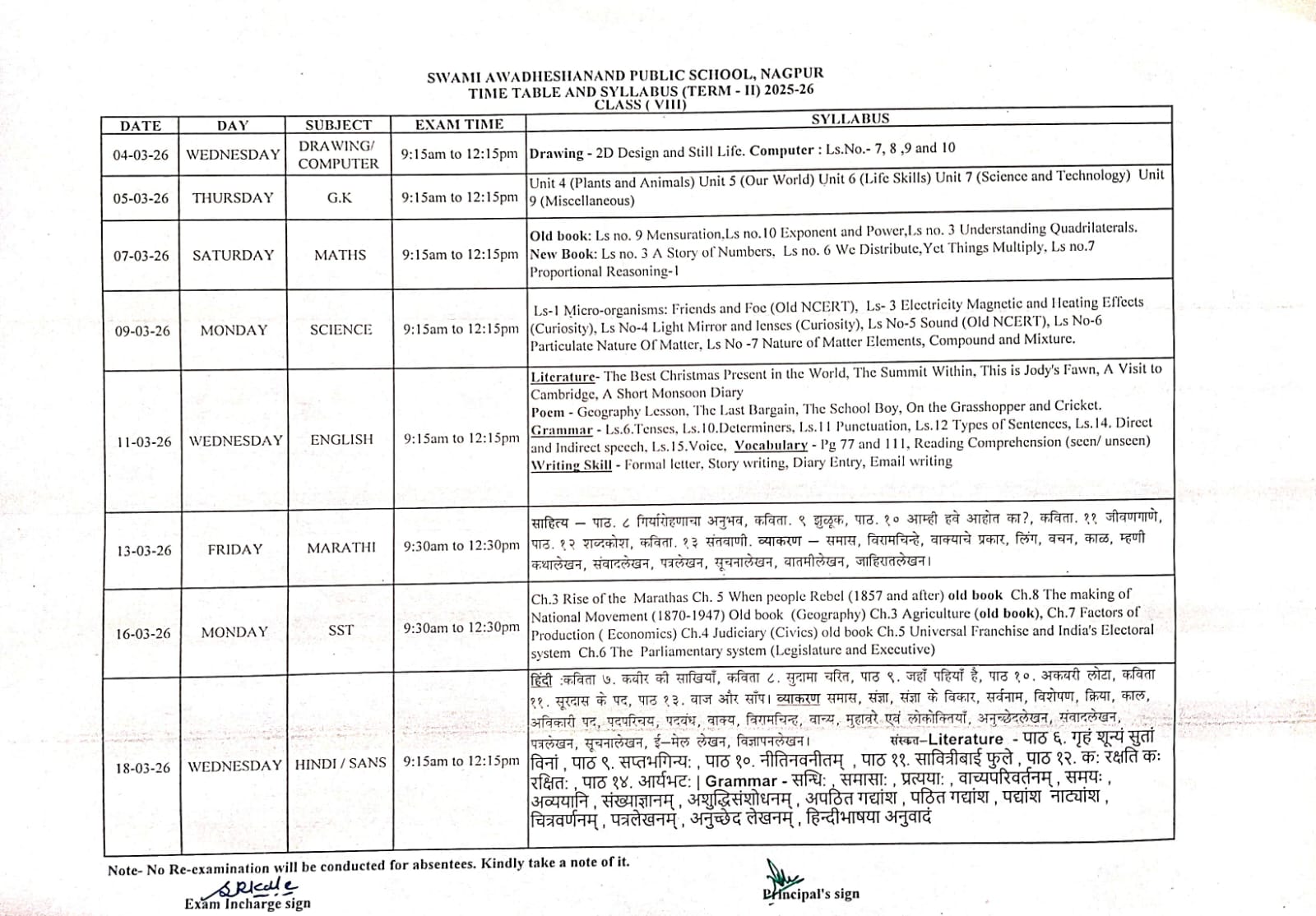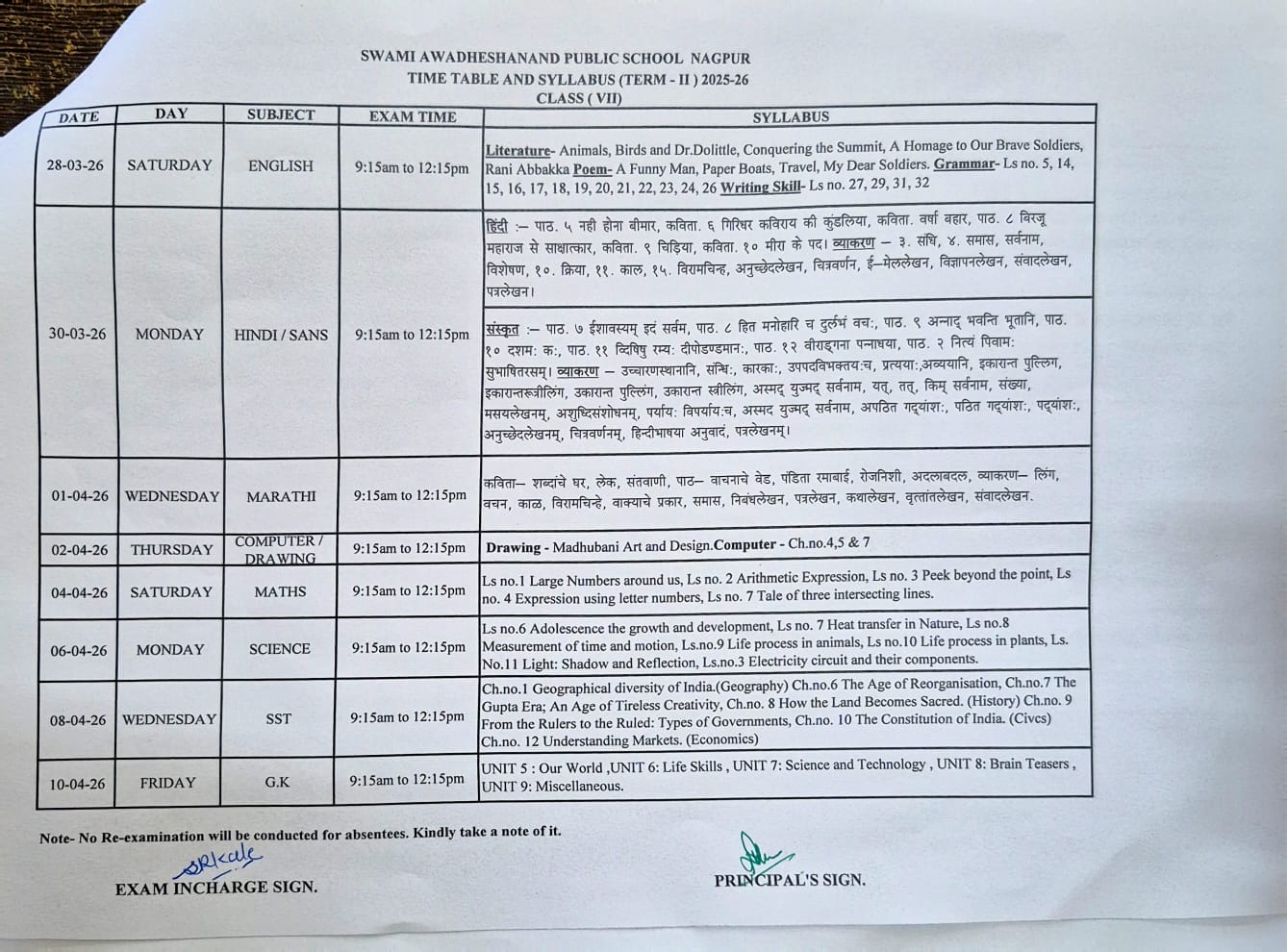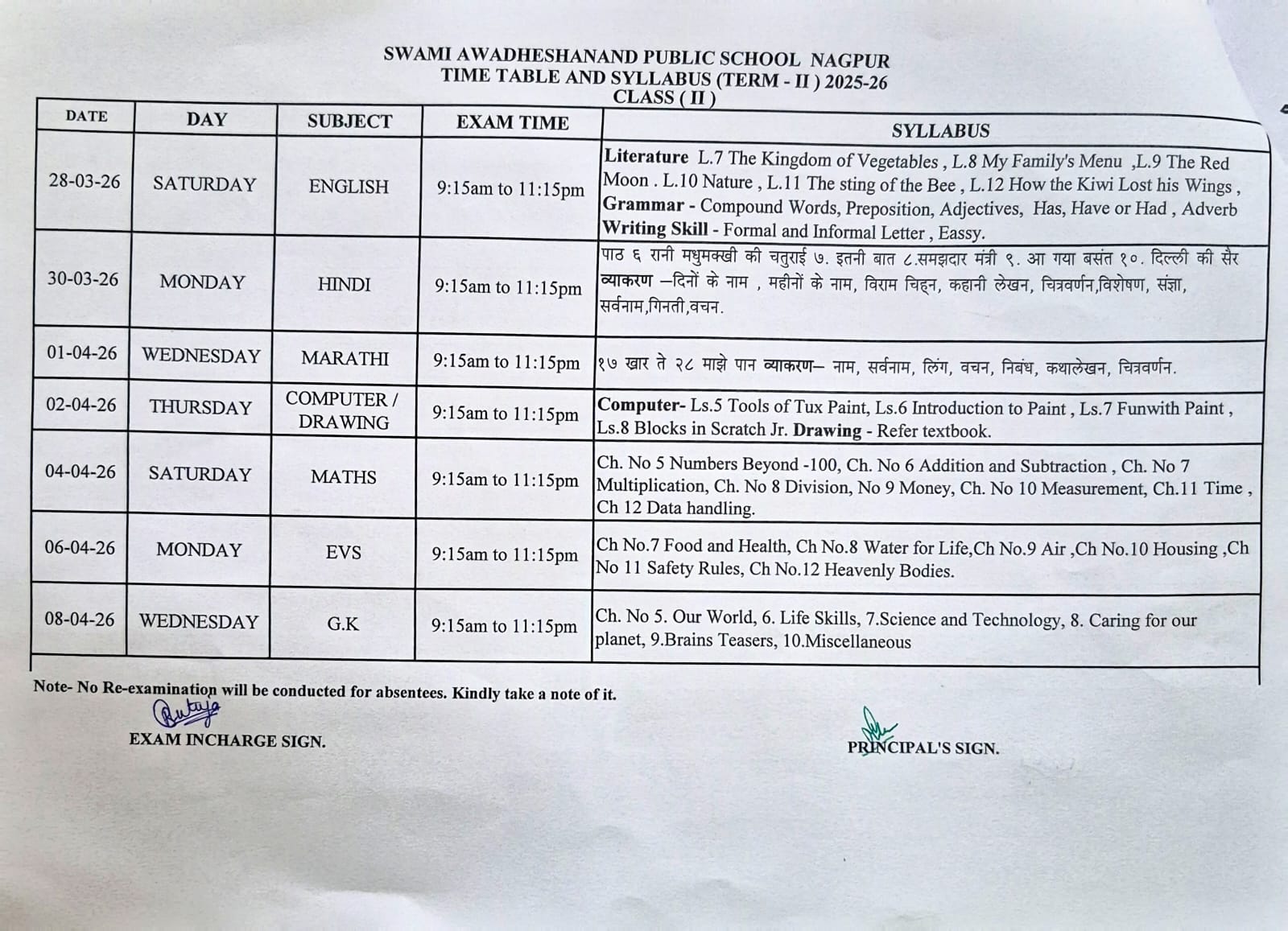 TERM-II Exam Time table and Syllabus
